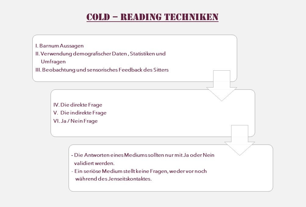 Durch die indirekte Frage im Jenseitskontakt wird der Sitter während des Cold-Readings aufgefordert Details zu berichten und gibt so dem Cold-Reader Informationen, welche er für die nächste Antwort verwendet [4].