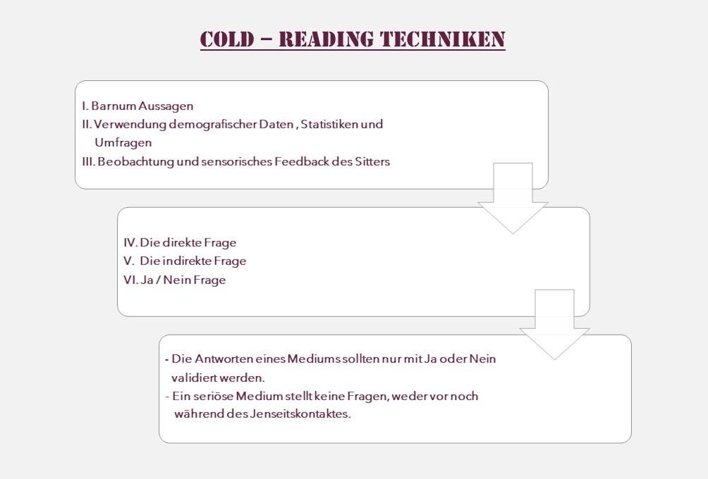 Cold - Reading ist eine Technik, welche von Mentalisten und von Menschen eingesetzt wird, die vorgeben, dass sie ein Hellseher und Medium sind. Cold-Reading Techniken können bestehen aus Barnum – Aussagen, demografischen Daten, Statistiken sowie Umfragen, der genauen Beobachtung des Sitters (Person, für welche der Jenseitskontakt bestimmt ist) sowie sensorischen Feedback des Sitters und der Technik bestimmter Fragestellungen, um so Informationen vom Sitter zu erhalten. Sowohl bei Jenseitskontakten, die für den Sitter als Einzelsitzung stattfinden als auch bei Jenseitskontakten vor einem Publikum findet Cold-Reading Anwendung.
