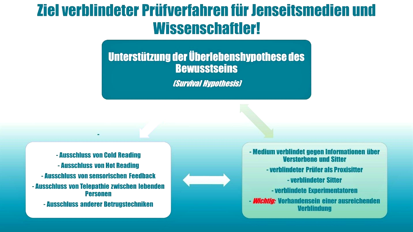 Die Grafik zeigt die Zielsetzung in Bezug auf die Überlebenshypothese des Bewusstseins (Survival Hypothesis) verblindeter Prüfverfahren für Jenseitsmedien sowie Wissenschaftlern.